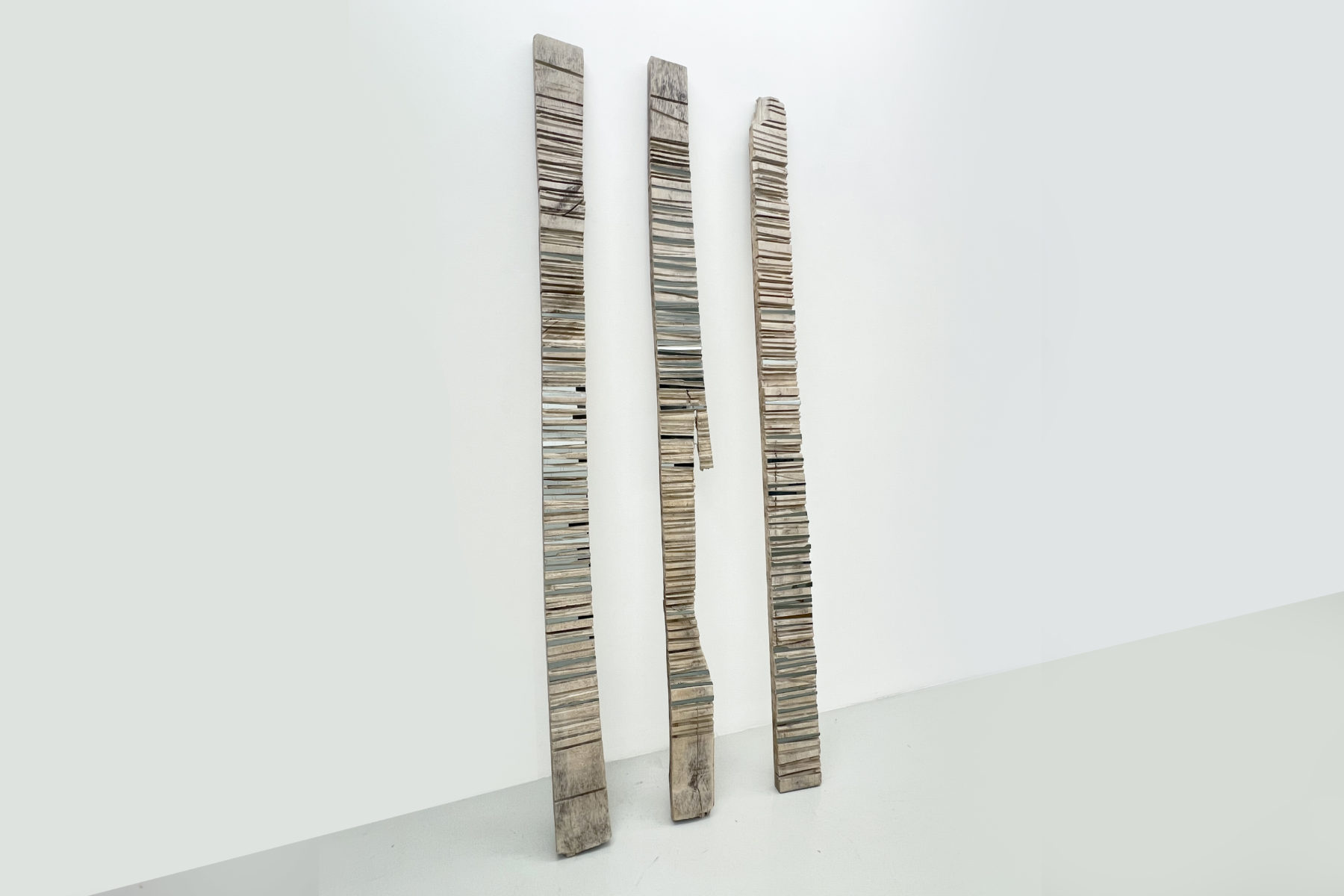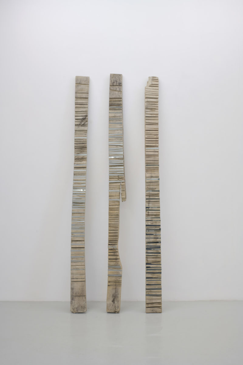 Planches de protection en chêne lors de coupe de blocs de pierre en carrière Oak protective boards used during the cutting of stone blocks in the quarry