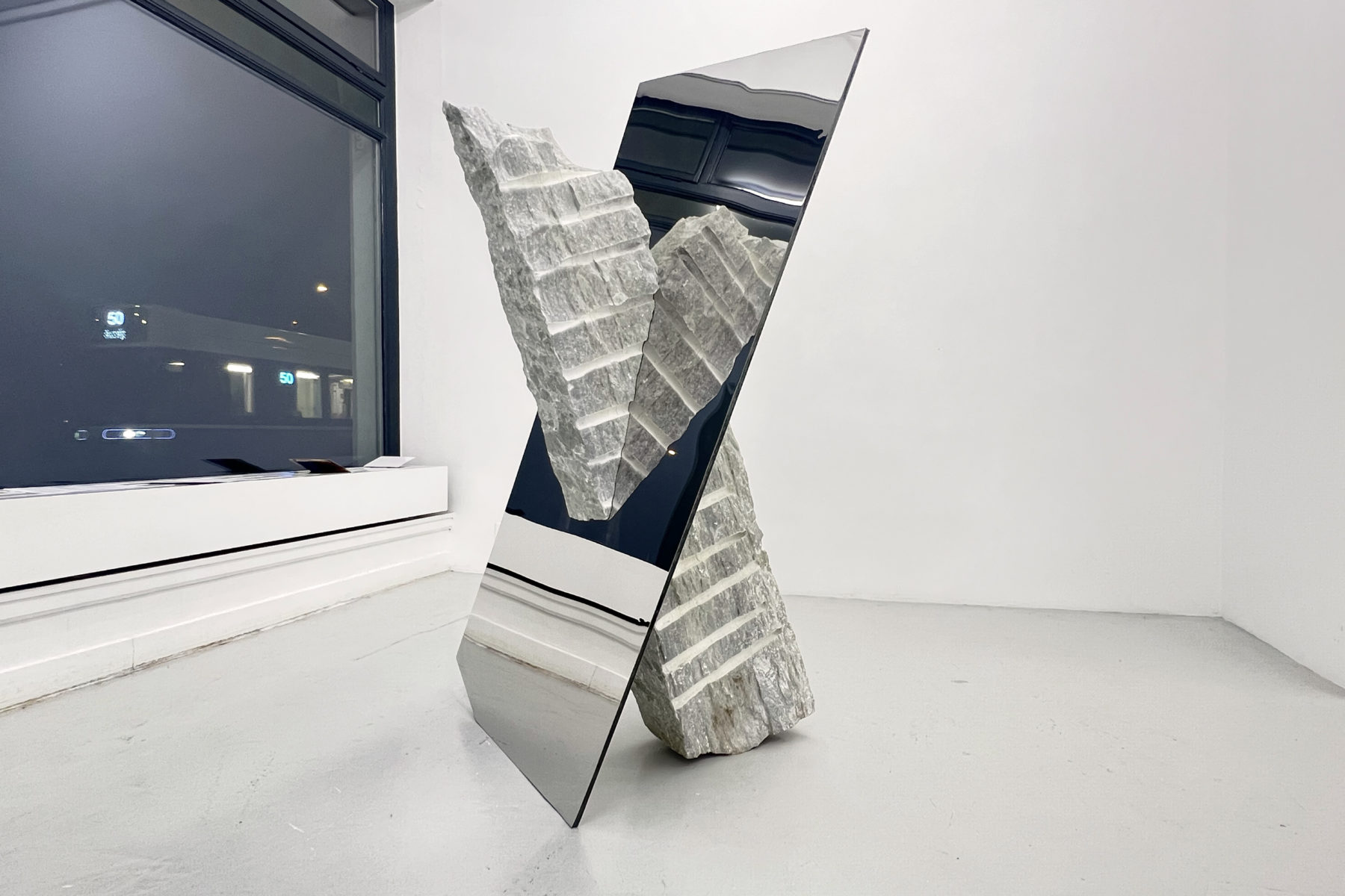 DRIFT #14 Exposition Sculpture DRIFT #14, 2026 Pierre de St-Léonard, acier inox et polimiroir 170 x 90 x 60 cm Exposition When Uncertainty becomes tangible Curatrice: Dorothea Strauss Stephan Kitsch gallery, Zurich Photo credit: Séverin Guelpa