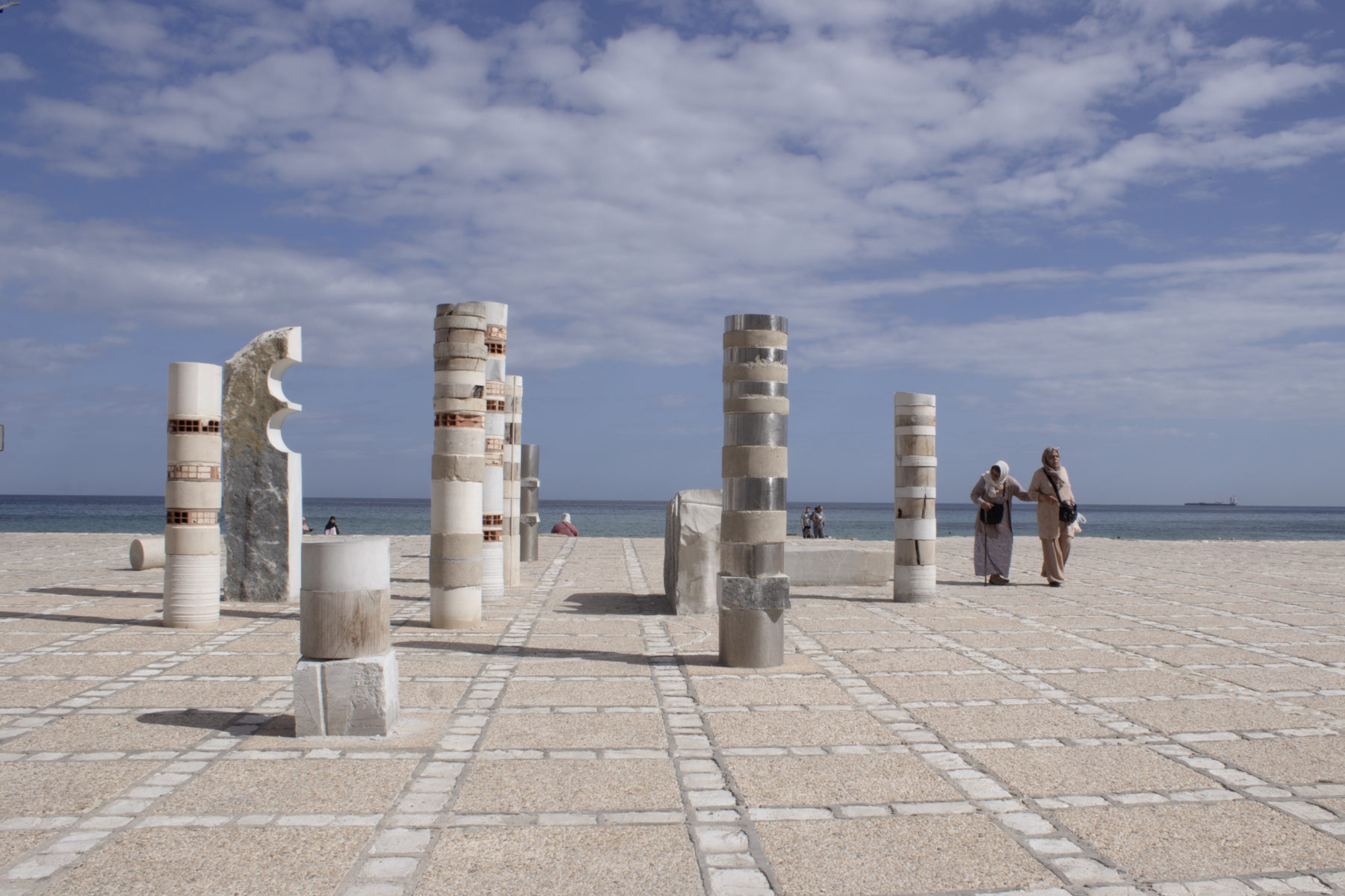 “On Boujaafar beach, Séverin Guelpa installs columns assembled piece by piece from various materials: concrete, earth, wood, stainless steel, rubble, marble and stone… These materials, unearthed from different places and sites in Sousse, tell the story of Sousse through its land, its agricultural land, its building sites, the traces of its disused hotels and industrial wastelands, its architectural diversity between yesterday and today… Core drilled, chiselled and cast, the pieces that make up these columns, made of sedimented strata, acquire a de facto archaeological aspect. These columns stand like a sequencing of the city’s genome, preserving its past, displaying its present and foreshadowing its future… in a word, its culture. This is the artist’s conception of the culture of the city, of any city for that matter, made up of components that are never homogeneous.” Wissem El Abed
