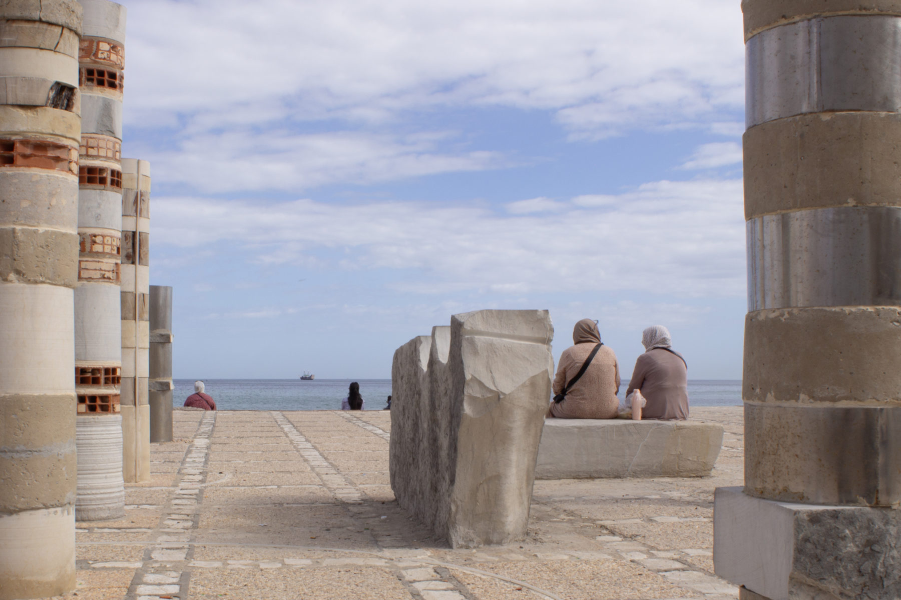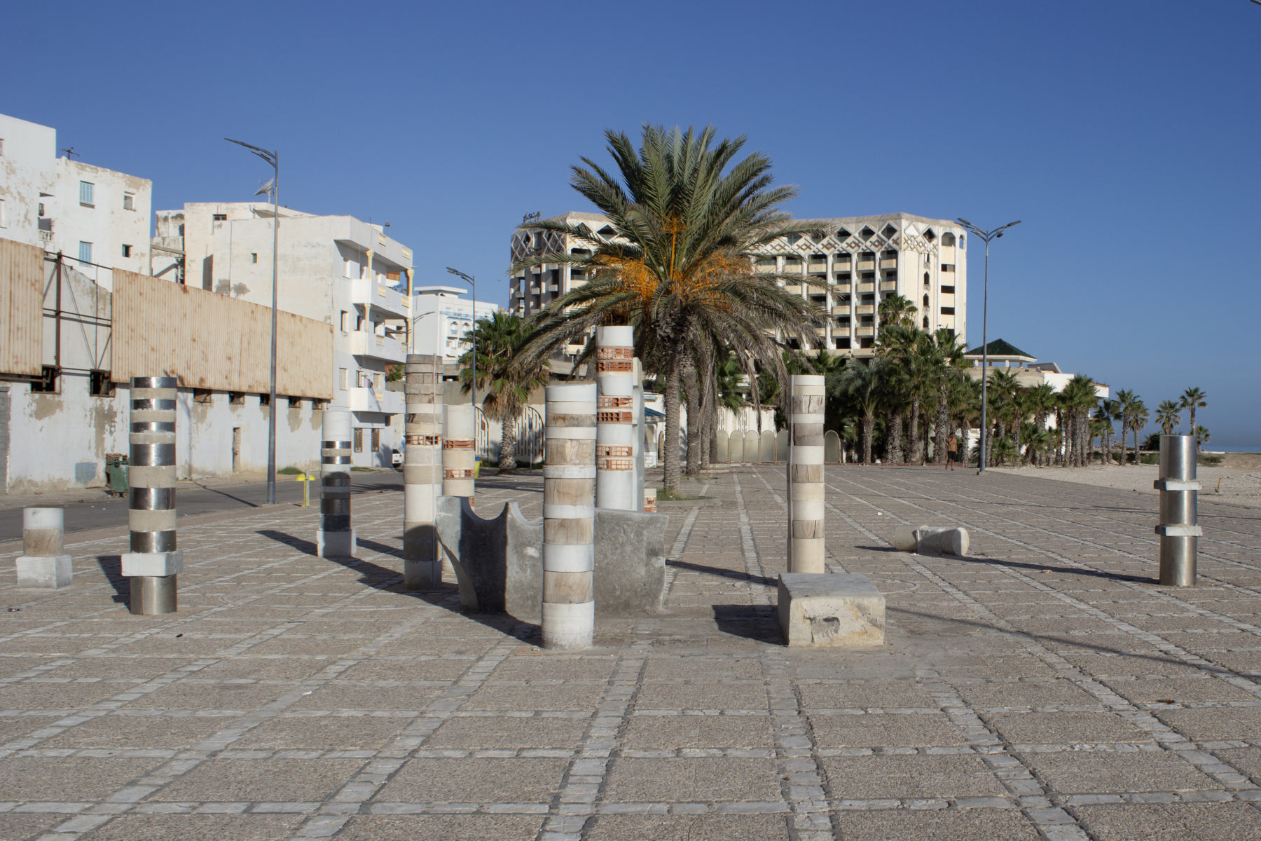 “On Boujaafar beach, Séverin Guelpa installs columns assembled piece by piece from various materials: concrete, earth, wood, stainless steel, rubble, marble and stone… These materials, unearthed from different places and sites in Sousse, tell the story of Sousse through its land, its agricultural land, its building sites, the traces of its disused hotels and industrial wastelands, its architectural diversity between yesterday and today… Core drilled, chiselled and cast, the pieces that make up these columns, made of sedimented strata, acquire a de facto archaeological aspect. These columns stand like a sequencing of the city’s genome, preserving its past, displaying its present and foreshadowing its future… in a word, its culture. This is the artist’s conception of the culture of the city, of any city for that matter, made up of components that are never homogeneous.” Wissem El Abed