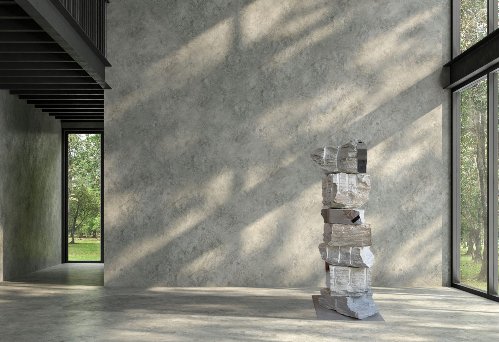 Cette oeuvre expose de grandes colonnes de pierre, parfois issues d’un seul bloc, dont la forme brute garde la mémoire du temps. Des miroirs gris fumé, découpés selon le profil de chaque pierre, y trouvent leur place : fragiles et réfléchissants, ils renvoient la pierre à elle-même tout en ouvrant de nouvelles perspectives. À chaque angle, le spectateur découvre un point de vue inédit, et le contraste entre matière et reflet transforme la contemplation en une expérience de perception renouvelée.