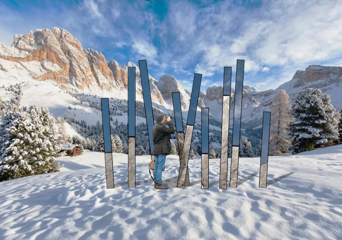 Star Axis lifts stone and steel toward the sky. Tall needles, upright or inclined, seek the vertical, dissolve into vastness, and weave a fragile link between earth and sky. Gathered together, they oscillate between order and chaos, perspective and instability—like a silent cartography of our gaze toward the infinite.