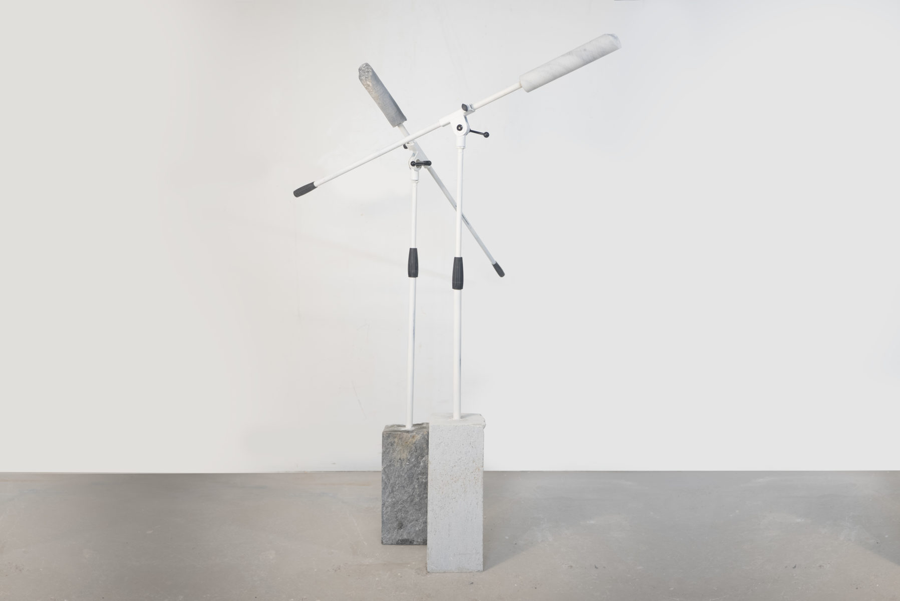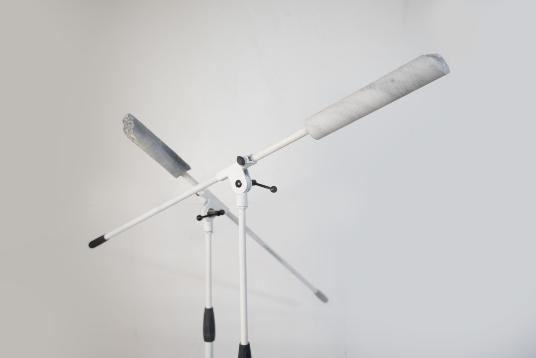 Talking Stones brings together stone core samples mounted on microphone stands, as if the material itself were invited to speak. Extracted from deep within the ground, these fragments become vectors of listening rather than mere objects. The arrangement suggests that the earth holds stories, tensions, and rhythms that still elude us. By placing these stones at voice height, the work invites a shift in attention toward what the ground can teach us, revealing the world as a living entity whose signals remain to be heard.