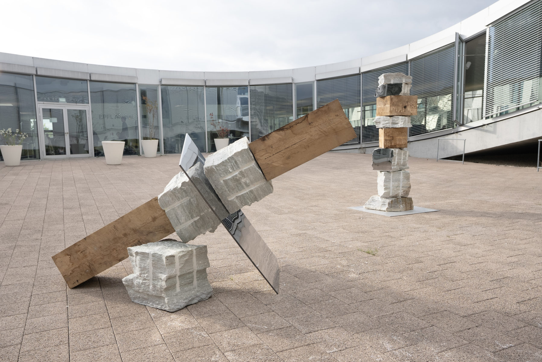 L’artiste a récupéré des pierres dans une carrière suisse, il ajoute des éléments réfléchissants, il compose avec des déchets métalliques et du bois de charpente. Ces œuvres, en équilibre-déséquilibre, manifestent les forces et les tensions, ainsi que les chutes, les glissements et les catastrophes possibles. Ces œuvres font aussi référence, de près ou de loin, aux événements intervenus récemment dans les villages de Blatten (Valais) ou de Brienz (Grisons), désormais célèbres pour leurs impressionnants glissements de terrain.
