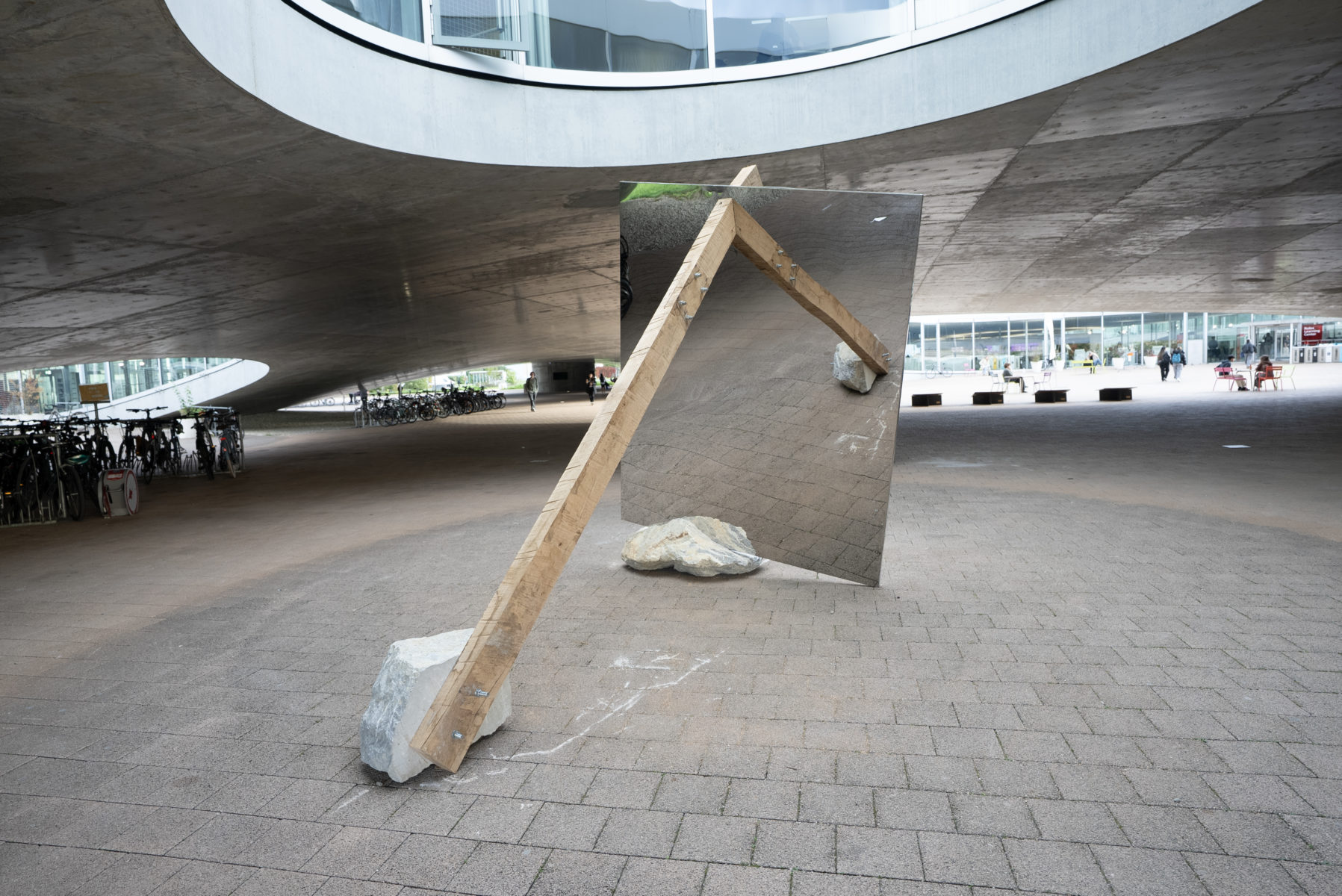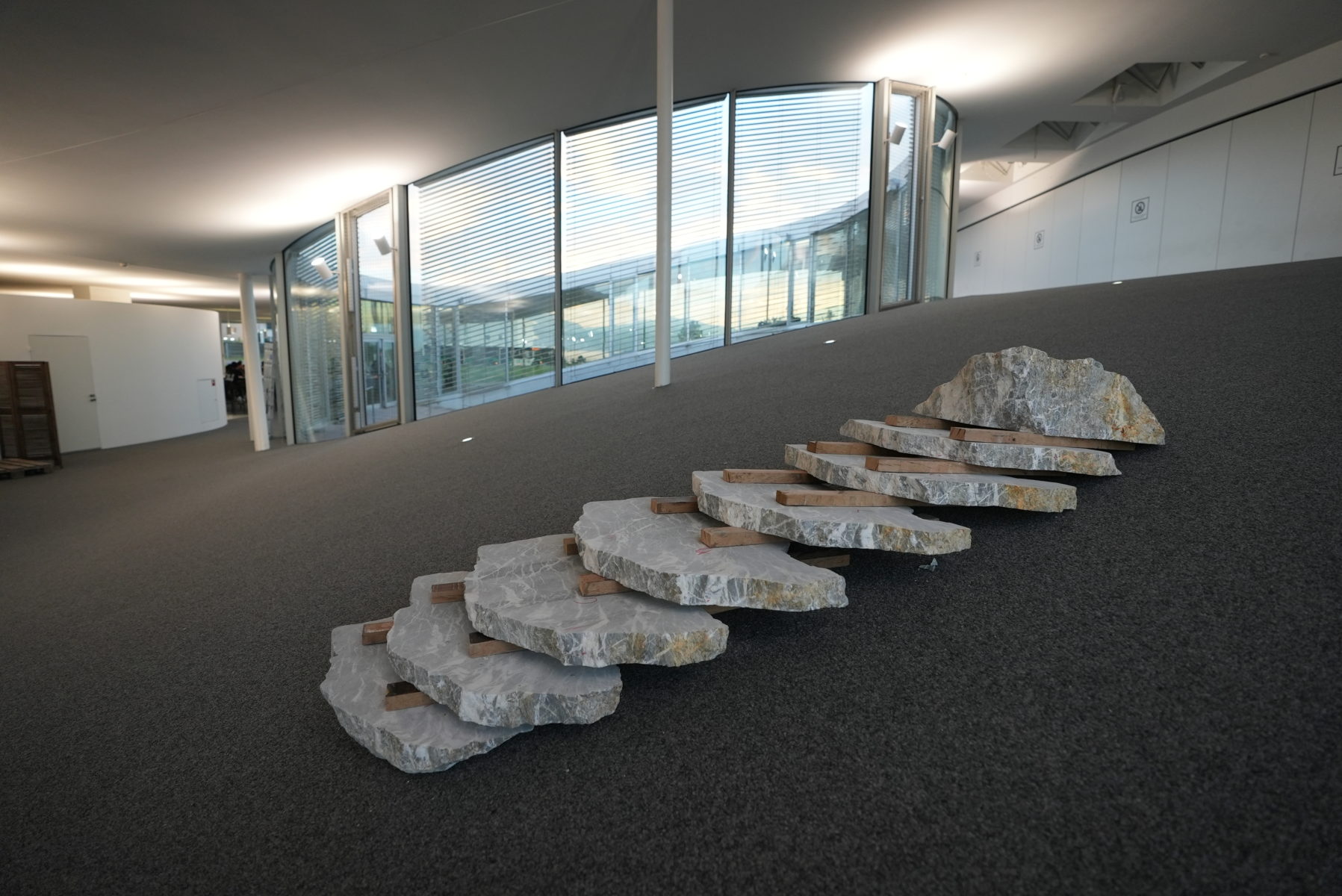 The artist collected stones from a Swiss quarry, adding reflective elements and incorporating metallic waste and structural timber. These works, poised between balance and imbalance, reveal forces and tensions, as well as the potential for collapse, slippage, and catastrophe. They also allude, directly or indirectly, to recent events in the villages of Blatten (Valais) and Brienz (Grisons), now known for their spectacular landslides.